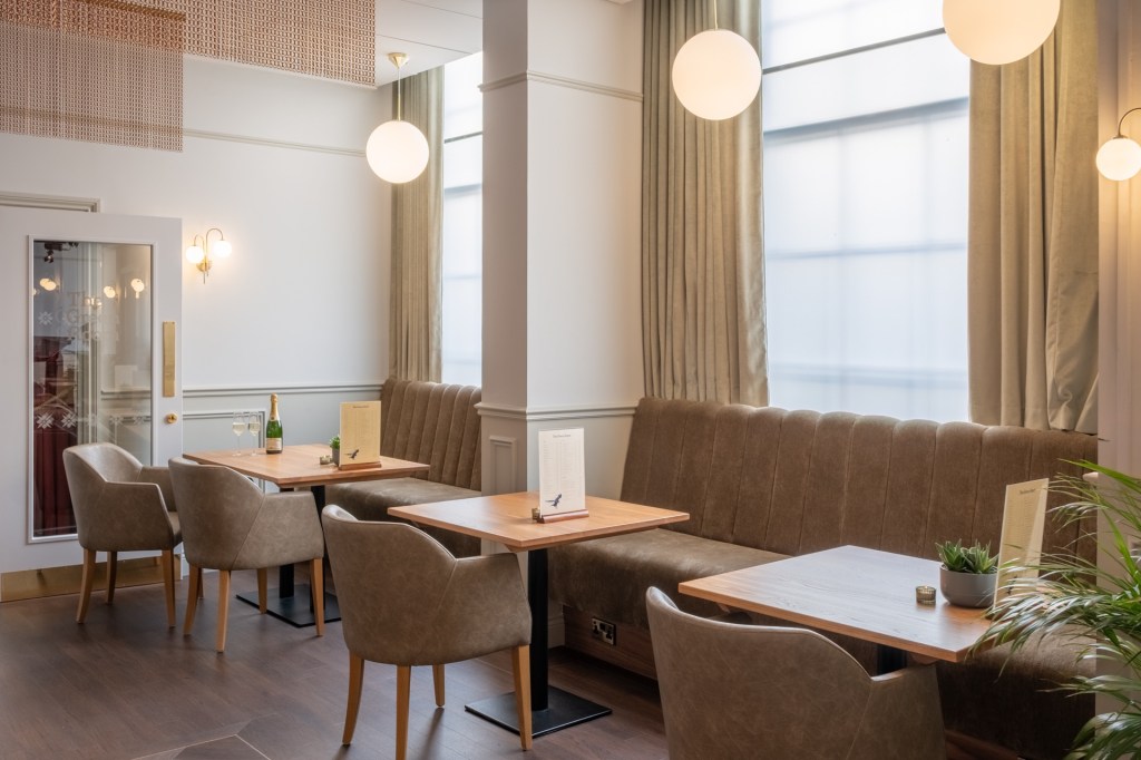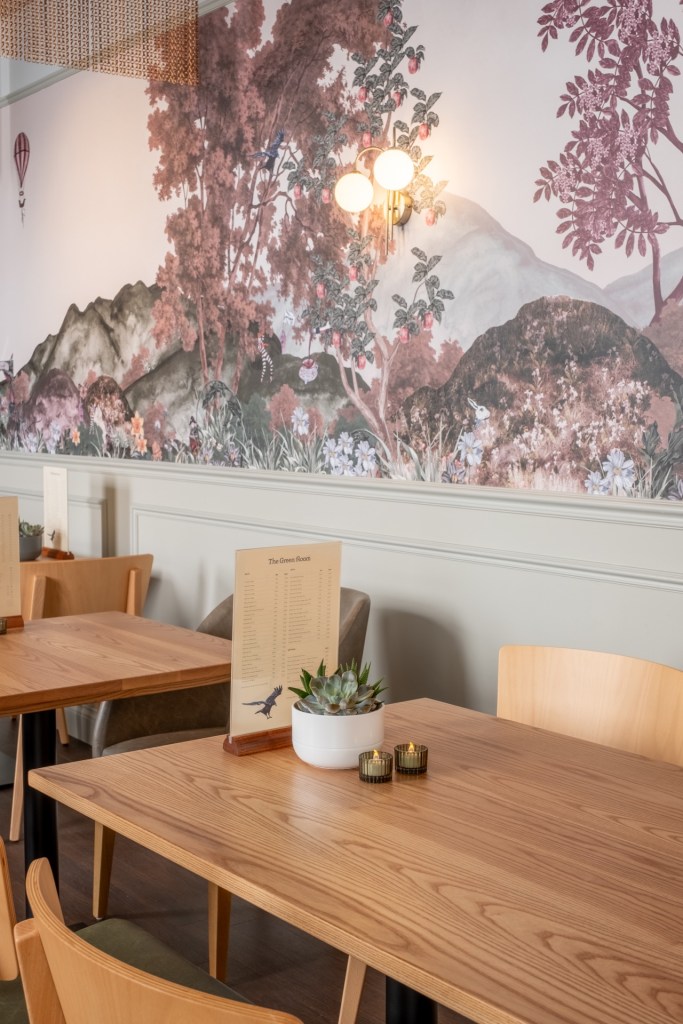 The bar is absolutely stunning furnished with velvet seating, touches of brass and wood, and an incredible statement wallpaper!